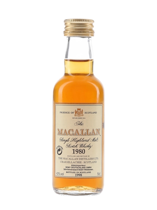 A bottle of The Macallan 1980, bottled in 1998 at 43% ABV. This was bottled for the German market and imported by Remy Deutschland GMBH.