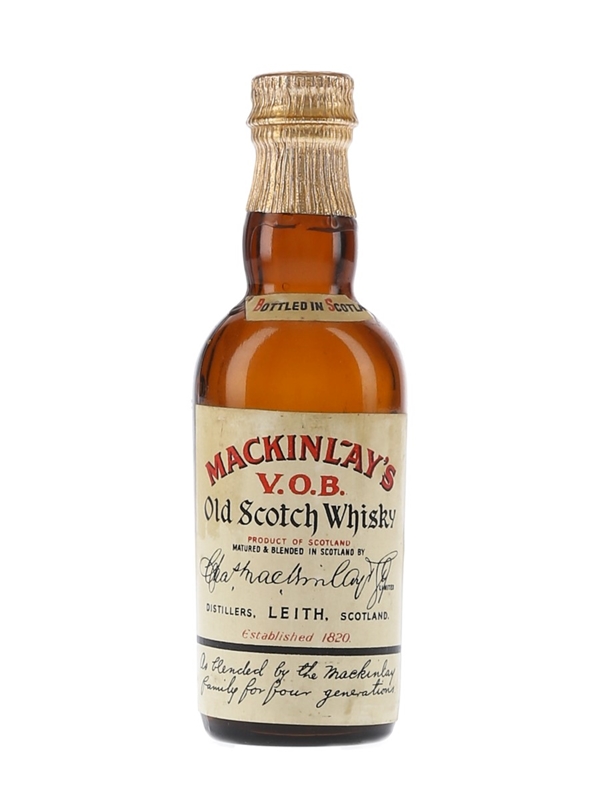 A miniature bottle of Mackinlay's VOB blended Scotch whisky, produced by Charles Mackinlay and Co. Limited. We estimate this was bottled in the 1950s to 1960s.
