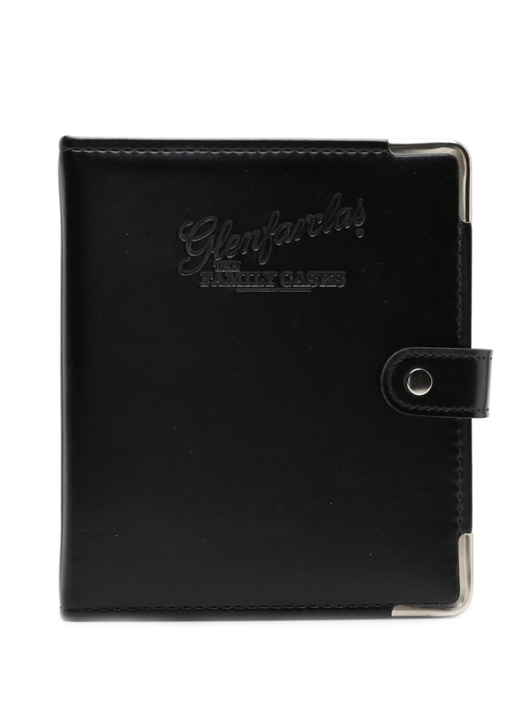 A leather bound folder containing information on the Glenfarclas Family Cask series. There is a card for every vintage from 1952 to 1994, with information including cask type, strength, number of bottles, and tasting notes by George S Grant.