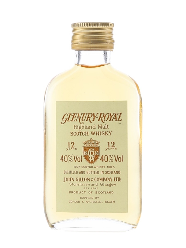 A bottle of Glenury-Royal 12 Year Old, produced by John Gillon & Company Ltd. and bottled by independent bottler Gordon & MacPhail. We estimate this was bottled in the 1980s.