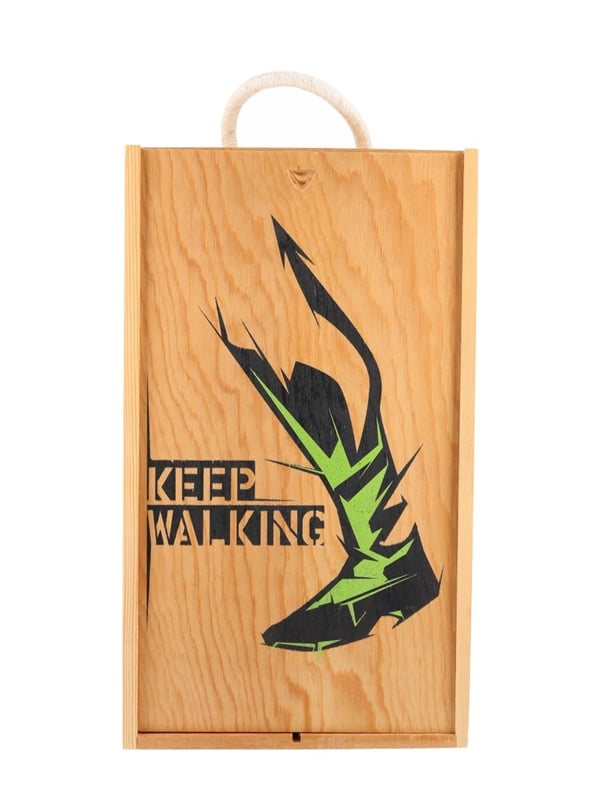 A wooden two-bottle box featuring an interpretation of Johnnie Walker's 'Keep Walking' and 'Striding Man' motifs. This was created by Scottish graffiti artist Derm following a commission by Edinburgh design agency Contagious. It was given to whisky writers attending a Diageo tasting event in 2011.