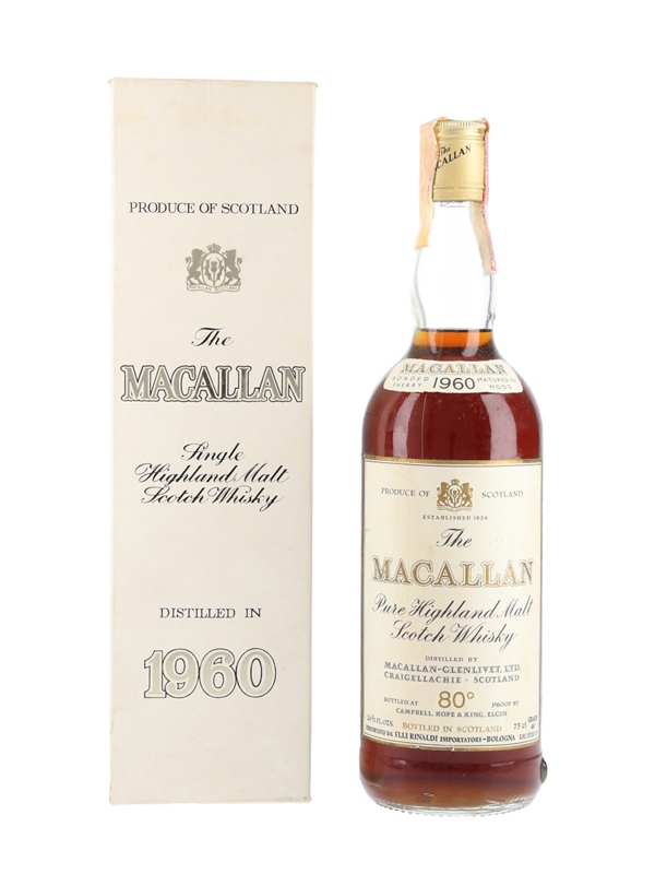 A bottle of The Macallan 1960, bottled by Campbell, Hope & King. This was bottled for the Italian market, and imported by Rinaldi, we estimate in the 1970s.