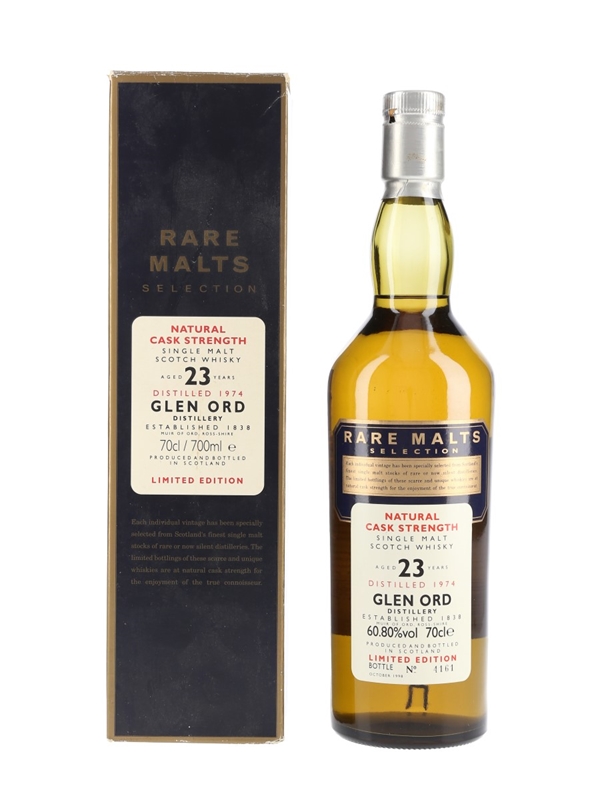 A bottle of Glen Ord 23 Year Old, distilled in 1974 and bottled in October 1998 for the Rare Malts Selection.