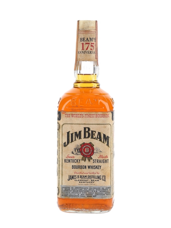A bottle of Jim Beam White Label 4 Year Old Kentucky straight bourbon whiskey, bottled to celebrate the distillery's 175th anniversary. This was bottled for the Italian market and imported by Carlo Salengo, we estimate in the 1970s.