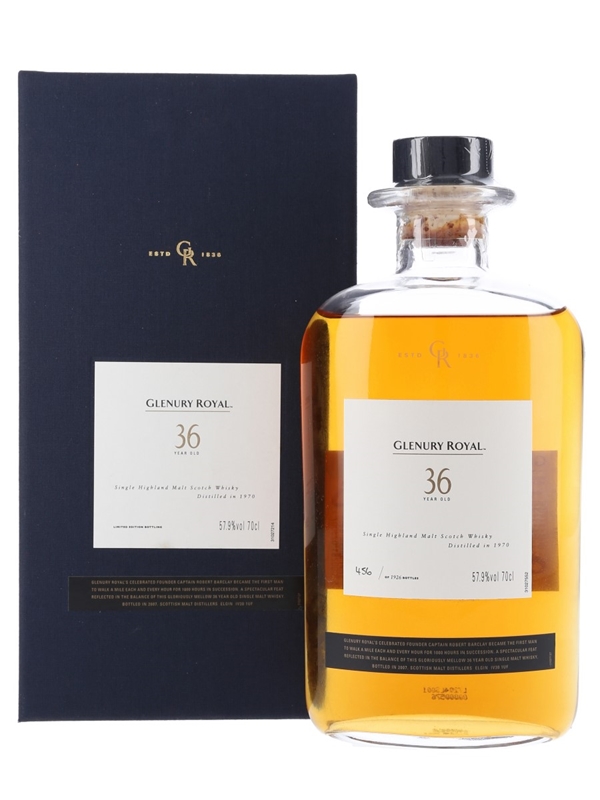 A bottle of Glenury Royal 36 Year Old, distilled in 1970. This is presented in an elegant oval bottle with a cork stopper.