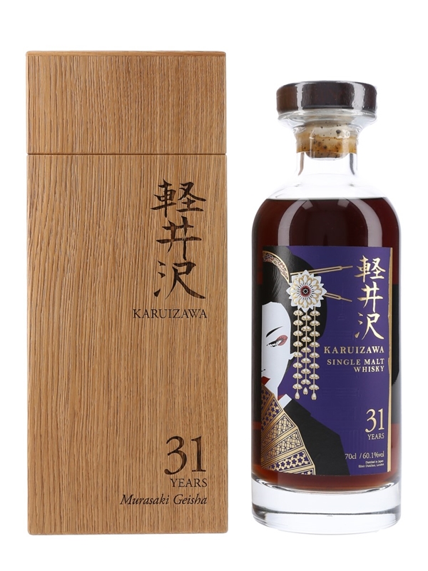 A bottle of Karuizawa 31 Year Old, one of a pair of Imperial Purple (Murasaki) Geishas released in 2018. This sherry-aged malt was distilled in the early 1980s and bottled by Elixir Distillers exclusively for The Whisky Exchange. Each bottle in the pair has complementary labels designed by The Whisky Exchange's creative director Raj Chavda and are presented in individual wooden cases.