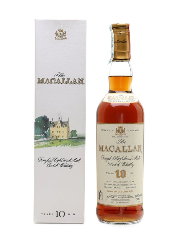 A bottle of The Macallan 10 Year Old, matured in sherry wood and selected by Armando Giovinetti for the Italian market. We estimate this was bottled in the late 1990s to early 2000s.