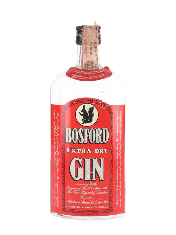 A bottle of Bosford Extra Dry London Gin. This was produced in Italy by Martini & Rossi according to the formula of Mr D Collins and Mr K V Bryant of London. We estimate this was bottled in the 1970s.