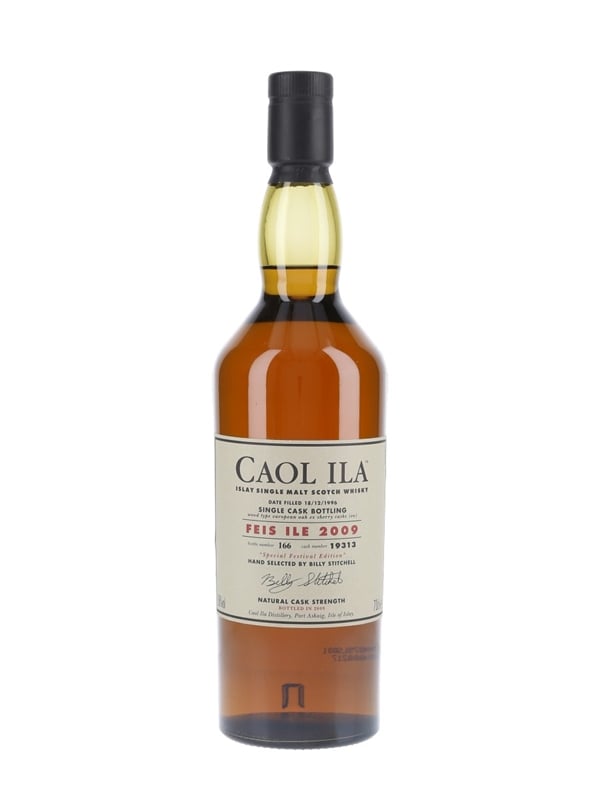 A bottle of Caol Ila 1996, selected by distillery manager Billy Stitchell and bottled in 2009 for Feis Ile, the Islay festival of music and malt. This was originally only available to purchase at the distillery.