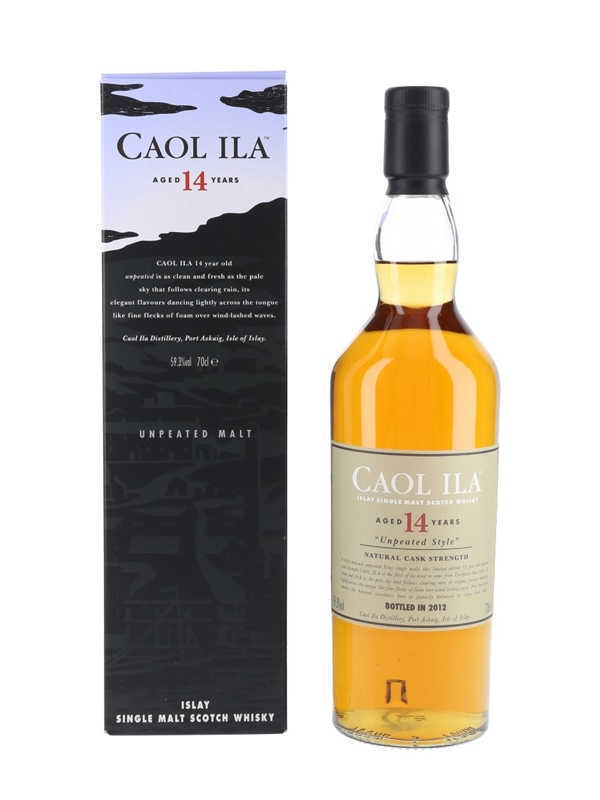 A bottle of Caol Ila 14 Year Old. This unpeated expression was matured in European oak casks and bottled for Diageo's Special Releases in 2012.