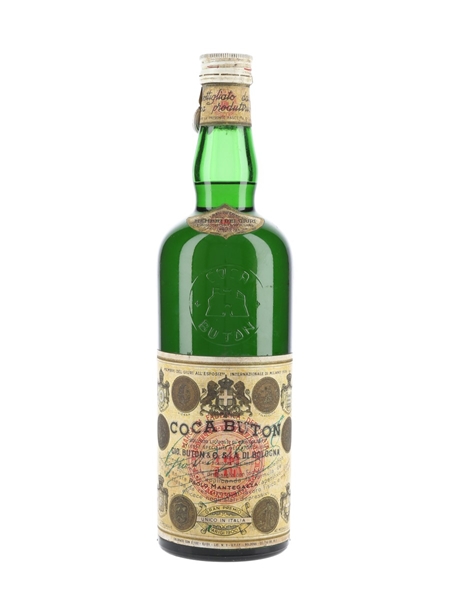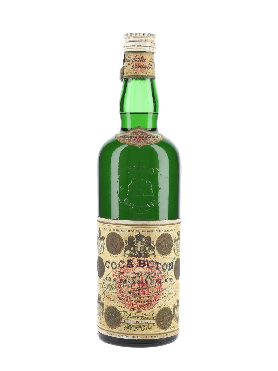 A bottle of Coca Buton, an Italian liqueur made from alcohol infused with coca leaves and other aromatic herbs. We estimate this was bottled in the 1950s.