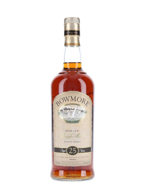 A bottle of Bowmore 25 Year Old. This presentation was available from 2004 and is now discontinued. This was bottled for the US market and imported by White Rock Distilleries Inc.