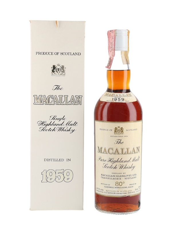 A bottle of The Macallan 1959, imported by Rinaldi for the Italian market. We estimate this was bottled in the 1970s.