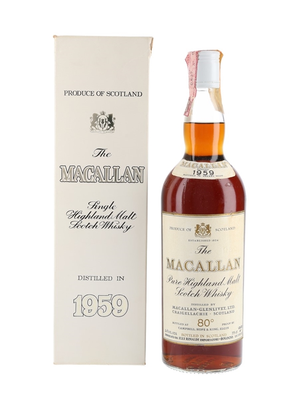 A bottle of The Macallan 1959, imported by Rinaldi for the Italian market. We estimate this was bottled in the 1970s.