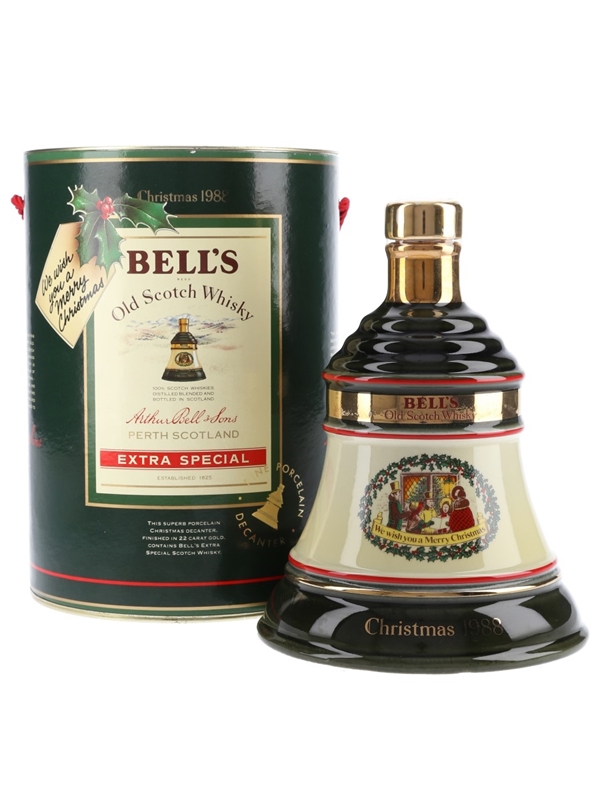 A ceramic decanter of Bell's Old Scotch Whisky released for Christmas 1988. The label depicts a choir singing above the words 'We wish you a merry Christmas'.
