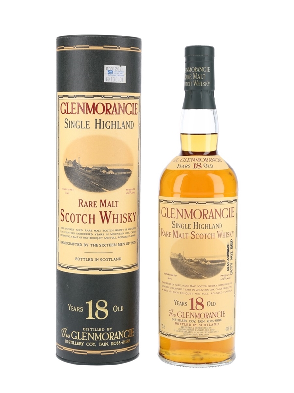 A bottle of Glenmorangie 18 Year Old. This was bottled for Malaysian duty free stores and imported and distributed by Jardine Wines & Spirits, we estimate in the 1990s.