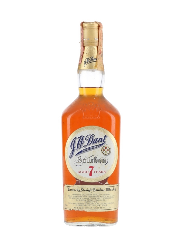 A bottle of J.W. Dant 7 Year Old Kentucky straight bourbon whisky. This was imported to Italy by Riunite Di Liquori, we estimate in the late 1960s to 1970s.