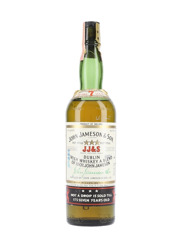 A bottle of John Jameson & Son 7 Year Old 3 Star Dublin Irish whiskey, bottled for the US market and imported by W A Taylor & Co, New York. We estimate this was bottled in the 1960s.