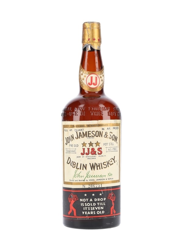 A 94cl bottle of John Jameson & Son 7 Year Old 3 Star Dublin Irish whiskey. This was bottled for the US market, we estimate in the 1930s.