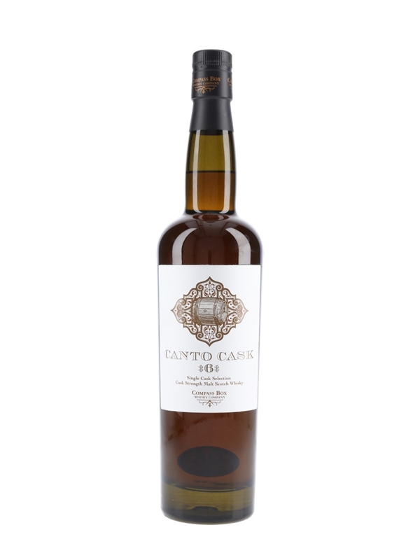 A bottle of Canto Cask 6 Single Cask Selection from independent bottler Compass Box. Cask number 6 was chosen by Compass Box Whiskymaker, John Glaser, for sale in the UK market, with all profits donated to a UK based charity. Cask number 6 was made with French oak heads and heavily toasted (level 7 on Compass Box's proprietary scale). This was bottled in July 2007.