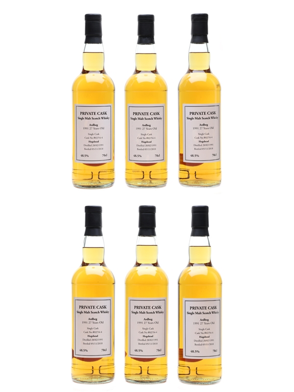 This lot contains six bottles of a private cask bottling of Ardbeg 27 Year Old. These were distilled on 28 February 1991, matured in a single hogshead, and bottled at cask strength on 5 November 2018.
