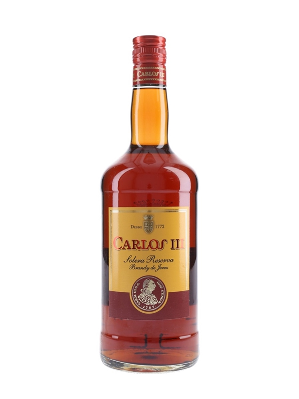 A litre bottle of Carlos III Solera Reserva Brandy de Jerez from Spain.