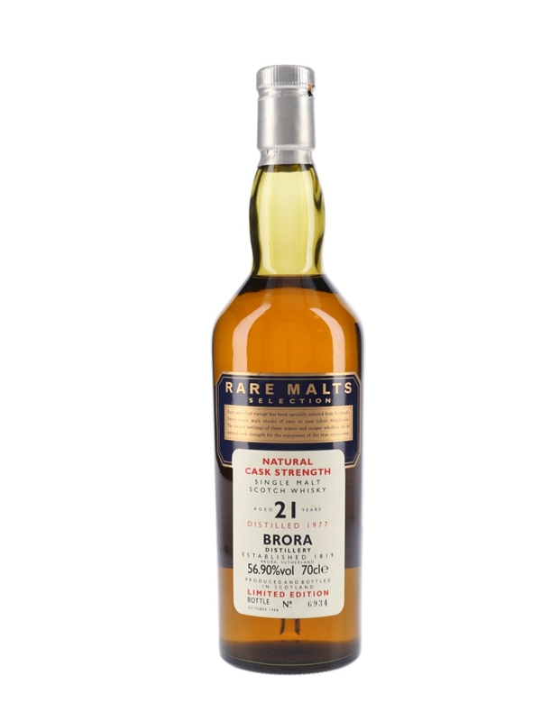 A bottle of Brora 21 Year Old. This was distilled in 1977 and bottled in October 1999 for Diageo's now discontinued Rare Malts Selection range.