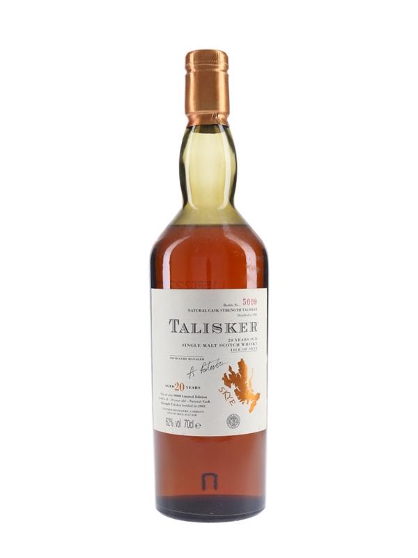 A bottle of Talisker 20 Year Old, bottled in 2002 at 62% ABV.