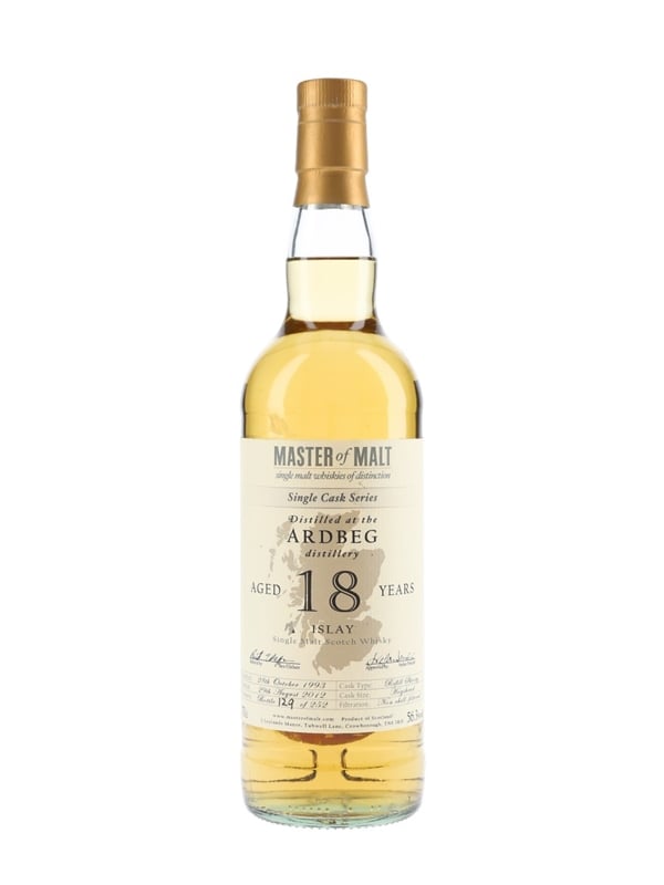 A bottle of Ardbeg 18 Year Old Islay Single Malt Scotch Whisky. This was distilled on 28 October 1993, matured in a single refill sherry hogshead, and bottled on 29 August 2012 by The Master Of Malt.