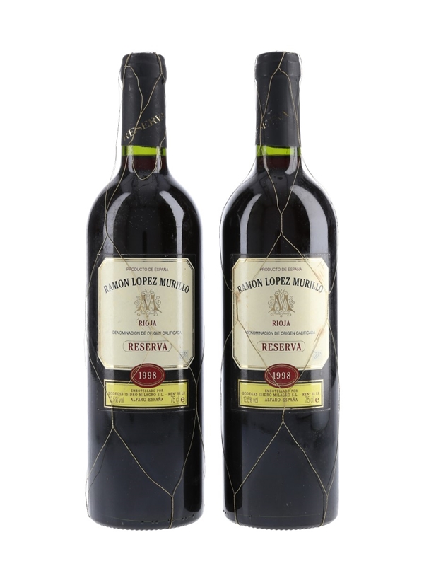 This lot contains two bottles of 1998 Reserva Rioja from Ramon Lopez Murillo, aged for 12 months in oak casks and 3 years in bottle.