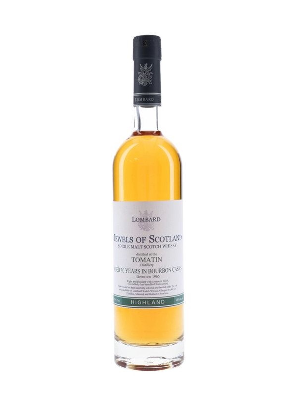 A bottle of Tomatin 30 Year Old. This was distilled in 1965, matured in bourbon casks, and bottled by Lombard Scotch Whisky for the Jewels of Scotland series.