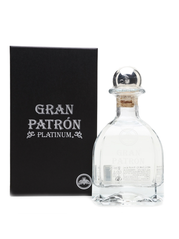 A bottle of Gran Patron Platinum, a premium Tequila made from 100% Weber blue agave. The agave is hand-selected for its high sugar content, steamed, crushed, fermented and distilled using traditional techniques. This Tequila is triple distilled, and matured in oak casks for a short time before filtering to remove the colour obtained from the cask. Each bottle is hand-polished and numbered.