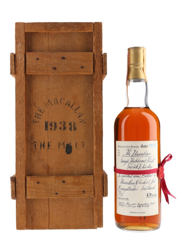 A bottle of The Macallan 1938. This bottling has a handwritten label and is presented in a wooden box. This was imported for the Italian market by Rinaldi, we estimate in the 1980s.