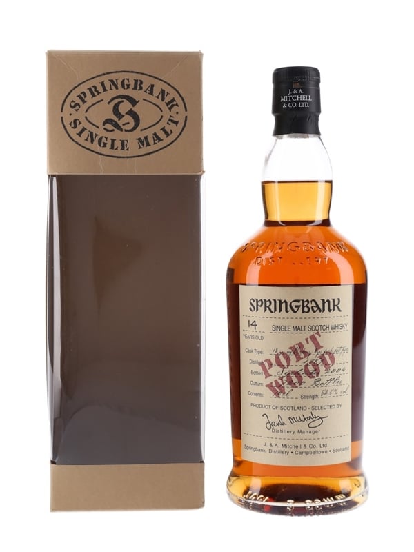 A bottle of Springbank 14 Year Old Campbeltown single malt Scotch whisky. This was distilled in 1989, aged for 12 years in refill sherry and two years in fresh port pipes, and bottled at cask strength in September 2004.