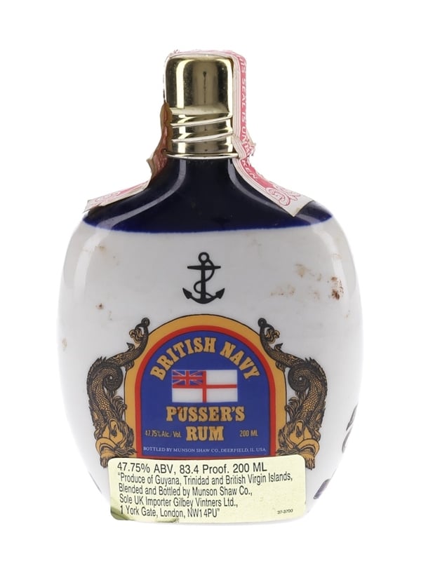A 20cl bottle of Pusser's Navy Rum, presented in a Wade ceramic hip flask decorated with traditional Royal Navy toasts. This was bottled by Munson Shaw Co. and imported to the UK by Gilbey Vintners Ltd., we estimate in the late 1970s to 1980s.