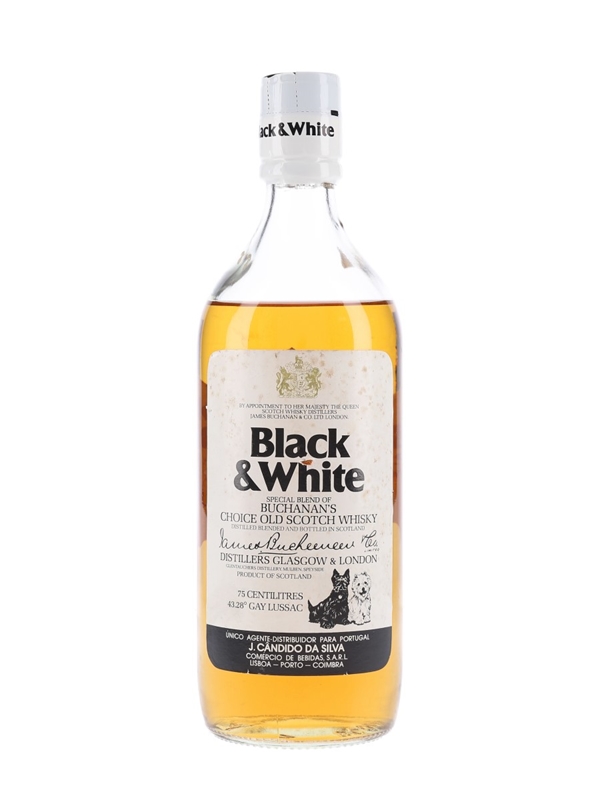 A bottle of Black & White blended Scotch whisky. This was imported to Portugal by Silva, we estimate in the late 1970s to early 1980s.