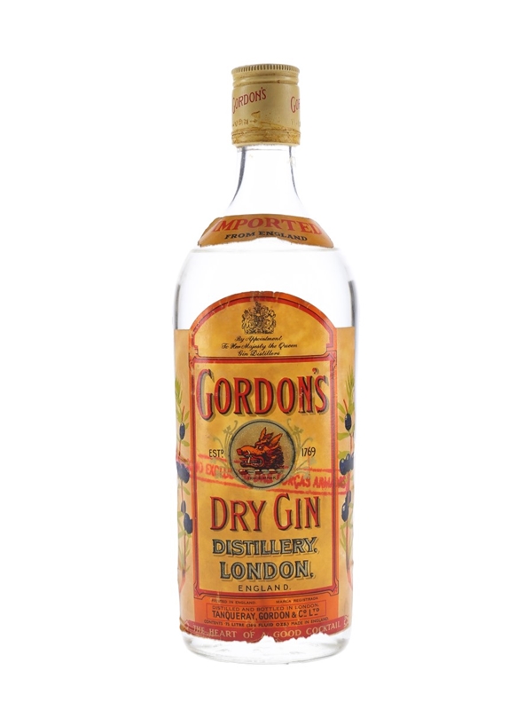 A bottle of Gordon's Dry Gin. This was imported to Portugal, we estimate in the 1960s and is stamped in Portuguese with the words 'Exclusivo das forças armadas' ('exclusively for the armed forces').