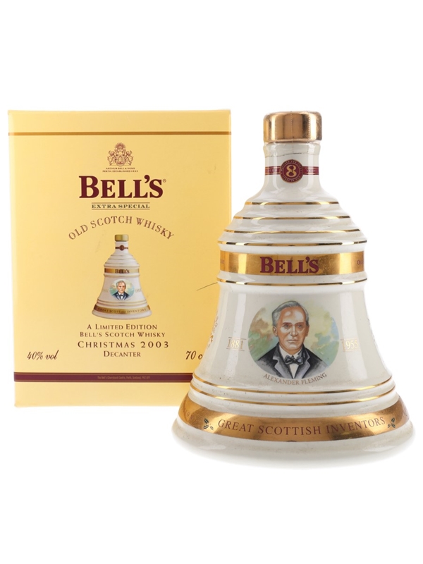 The Christmas 2003 edition of the Bell's commemorative decanter series. This contains Bell's Extra Special 8 Year Old whisky. The bottle depicts Alexander Fleming, Scottish biologist and discoverer of Penicillin.