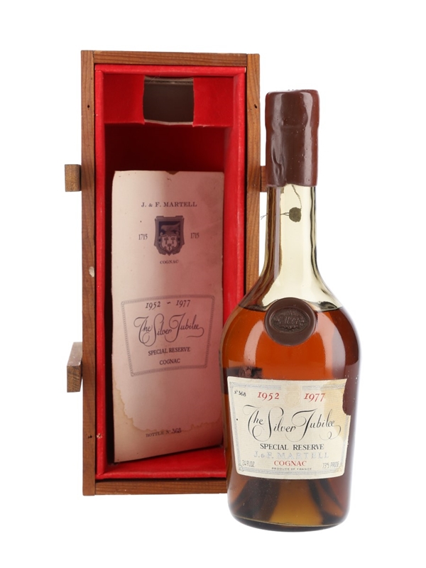 A bottle of Martell Silver Jubilee Cognac presented in a wooden case. This bottling comprises four vintages, 1815, 1906, 1914 and 1918, and was released to celebrate Queen Elizabeth II's Silver Jubilee in 1977.