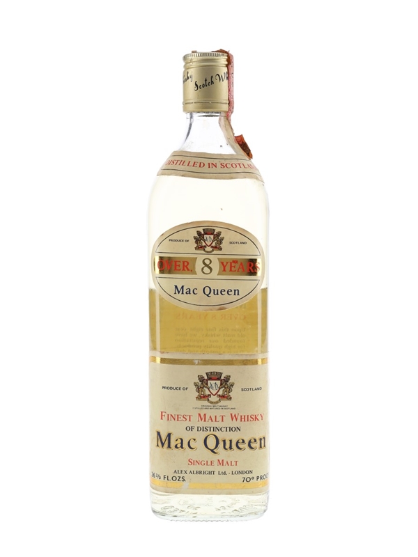 A bottle of Mac Queen 8 Year Old Finest Malt Whisky Of Distinction Single Malt Whisky Distilled In Scotland, Alex Albright Ltd. London.