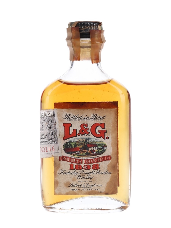A miniature bottle of Labrot & Graham 1838 Kentucky straight bourbon whiskey. This was distilled by Labrot & Graham and bottled by Brown Forman Incorporated. The tax strip states this was made in Fall 1936 and bottled in bond in Fall 1940.