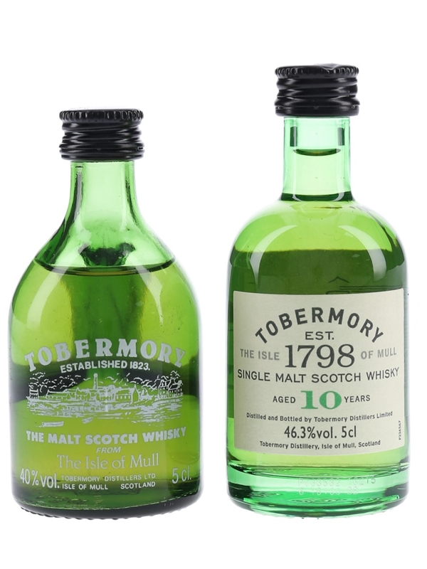 This lot contains two miniature bottles of Tobermory, an unpeated single malt Scotch whisky from the Isle of Mull:
