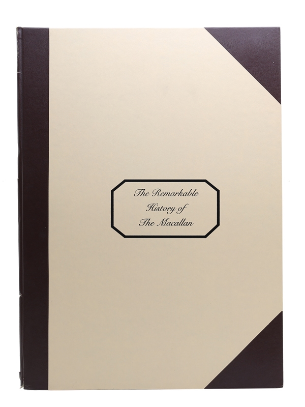The Remarkable History Of The Macallan presented in a leather bordered folio. This series of 12 prints tells the story of Scotch whisky and The Macallan in copperplate writing and watercolour pictures. The pictures are reproductions of works by Sara Midda, 1975.
