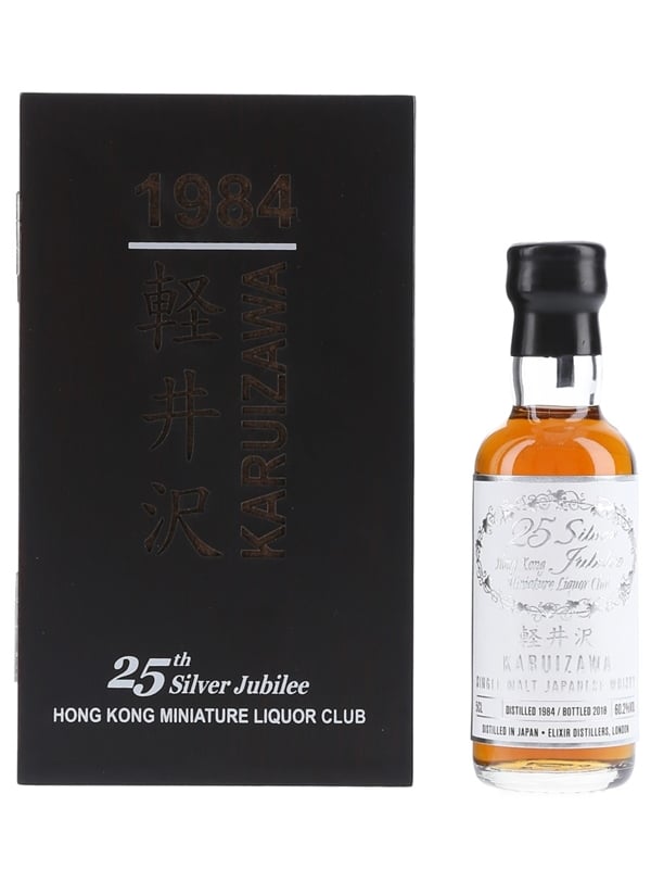 A miniature bottle of Karuizawa 1984, bottled in 2018 for the Silver Jubilee of the Hong Kong Miniature Liquor Club.