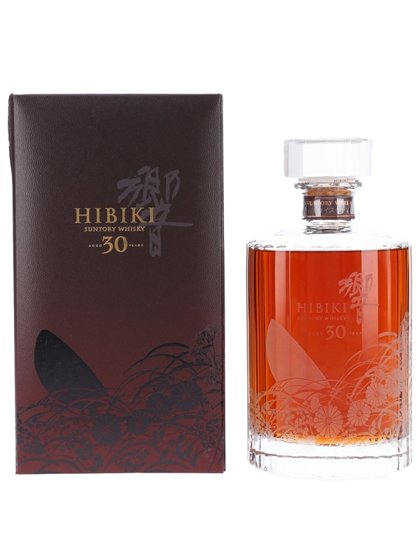 A bottle of Hibiki 30 Year Old blended Japanese whisky. This is a critically acclaimed blend from Suntory and is presented in a Kagami crystal decanter.