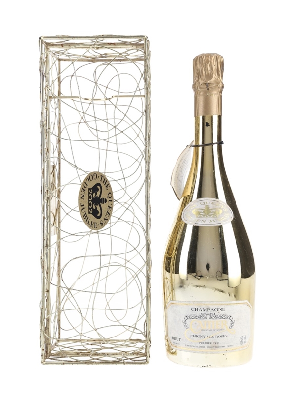 A bottle of Cattier Chigny Les Roses Premier Cru Champagne, in a gold bottle with a wire presentation case. This was bottled for Queen Elizabeth II's Golden Jubilee in 2002.