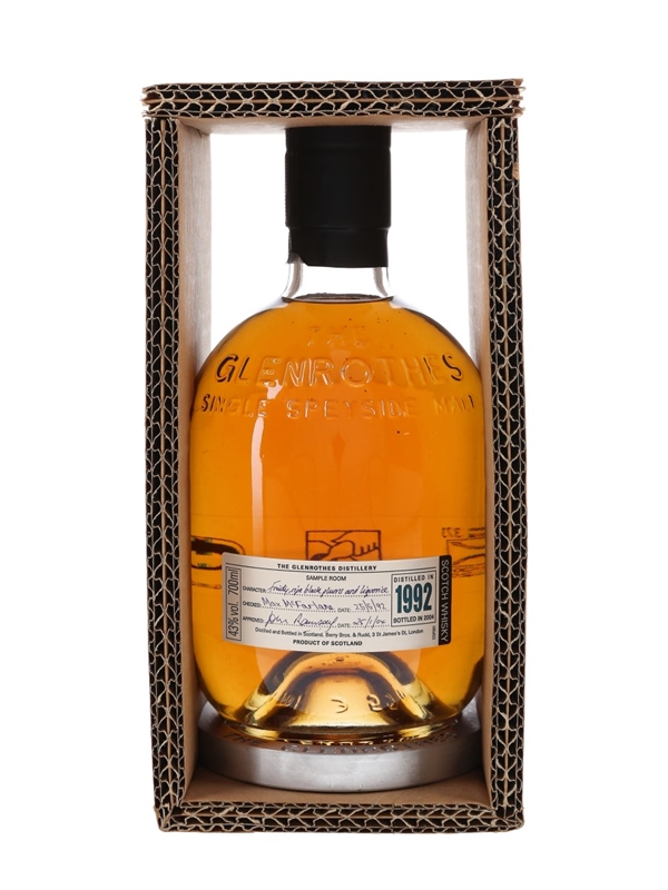 A bottle of The Glenrothes, distilled in 1992 and bottled in 2004. The label describes the character of the whisky: fruity, ripe black plums and liquorice.