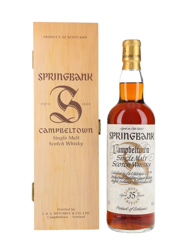 A bottle of Springbank 35 Year Old, bottled as part of the Millennium series. This was originally sold as part of a set which included whiskies ranging from 25 to 50 years old.