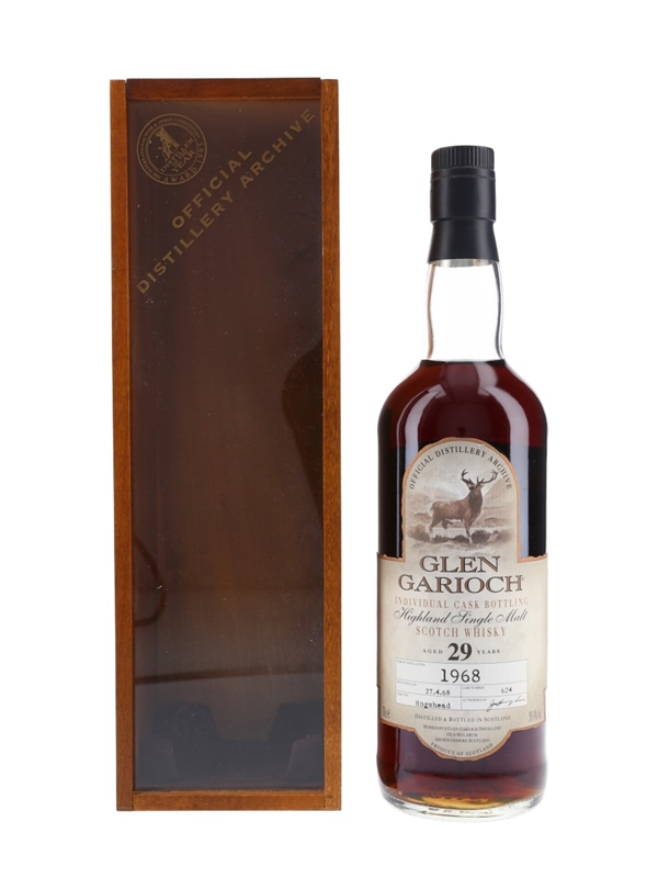 A bottle of Glen Garioch 29 Year Old Highland single malt Scotch whisky. This was distilled on 27 April 1968 and bottled at cask strength in 1997 from a single hogshead held in the distillery archive.