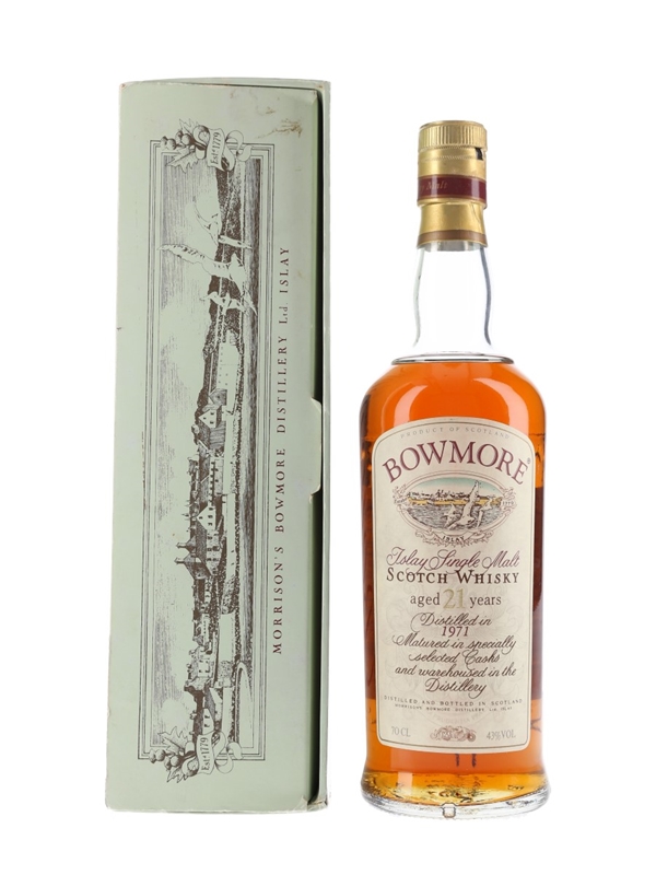 A bottle of Bowmore 21 Year Old Islay single malt Scotch whisky. This was distilled in 1971 and bottled at 43% ABV in the early 1990s.